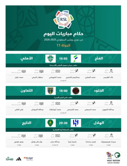 وجاء طاقم حُكام مباريات اليوم الجمعة في الجولة الحادية عشرة من عمر دوري روشن السعودي كالتالي…