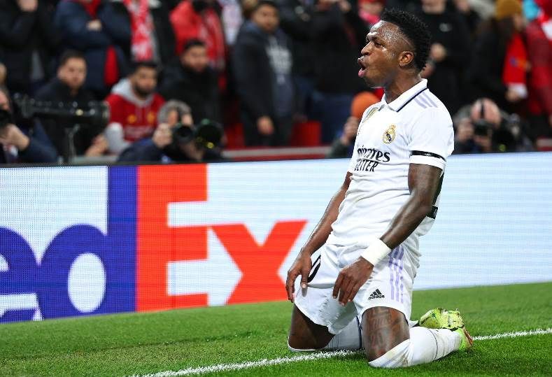 موقع اخبار كورة - أحرز البرازيلي فينيسيوس جونيور هدفين متتاليين لفريق ريال مدريد أمام ليفربول في المباراة التي تجمعهما الآن ضمن منافسات الجولة الذهاب بدور الـ 16 ببطولة دوري أبطال أوروبا، على ملعب أنفيلد.