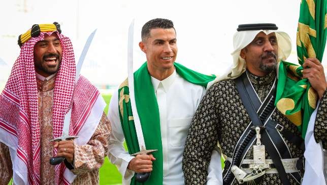 وظهر رونالدو وهو يرتدي الزي التراثي السعودي “المرودن”، ويؤدي العرضة وهي رقصة شعبية تؤدَّى في المناسبات الوطنية.
