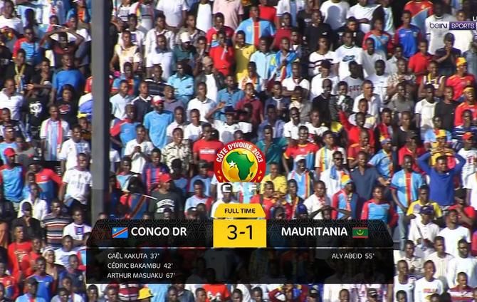 وتقدم غايل كاكوتا لأصحاب الأرض في الدقيقة 37 ثم أضاف سيدريك باكامبو الهدف الثاني لمنتخب الكونغو الديمقراطية في الدقيقة 42 قبل أن يقلص علي عبيد الفارق بإحرازه هدف موريتانيا الوحيد في الدقيقة 55.