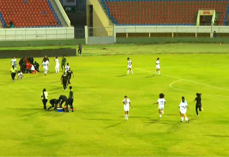 وسقطت لاعبة وقائدة منتخب مصر سالي منصور، على الأرض دون تدخل، مما تسبب في نزول الجهاز الفني والطبي والإداري، بجانب رجال الإسعاف والبديلات إلى أرض الملعب لإنقاذها.
