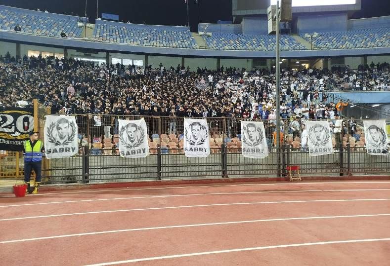 وفي نفس الوقت قامت الجماهير برفع لافتات تحمل صورة محمد صبري نجم الزمالك الراحل.