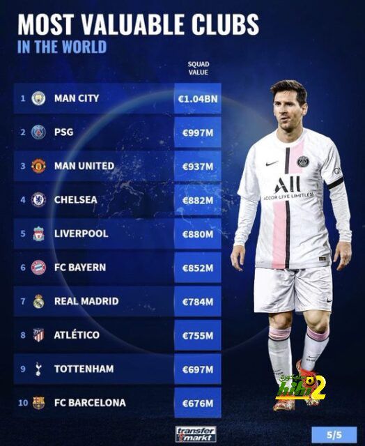 هاي كورة – يتصدر مانشستر سيتي الأندية الأعلى قيمة سوقية في العالم بـ 1.04 بليون يورو ، بينما يليه باريس سان جيرمان بـ 997 مليون يورو .