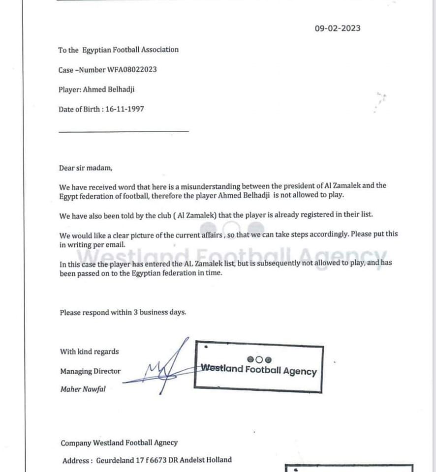 وطالب الوكيل في خطابه لاتحاد الكرة معرفة الموقف الحالي للاعب من أجل اتخاذ الخطوات بناءً عليها، مع انتظار الرد خلال 3 أيام عمل.
