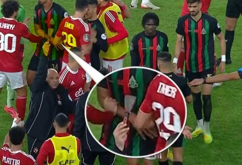 وشهدت مواجهة الأهلي أمام الجيش الملكي المغربي أحداثًا مؤسفة بعد إلقاء الزجاجات والأدوات الحادة على لاعبي المارد الأحمر في الملعب.