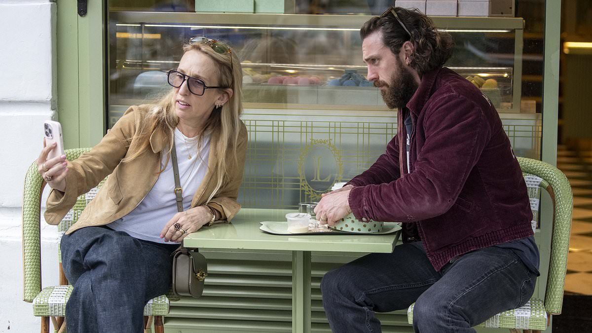 Meanwhile Sam, 57, looked effortlessly chic in a beige jacket and jeans, teamed with chunky black heels and sunglasses