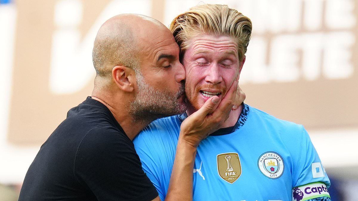 Pep Guardiola pictured (left) kissing Kevin De Bruyne (right) after Man City beat Chelsea 2-0