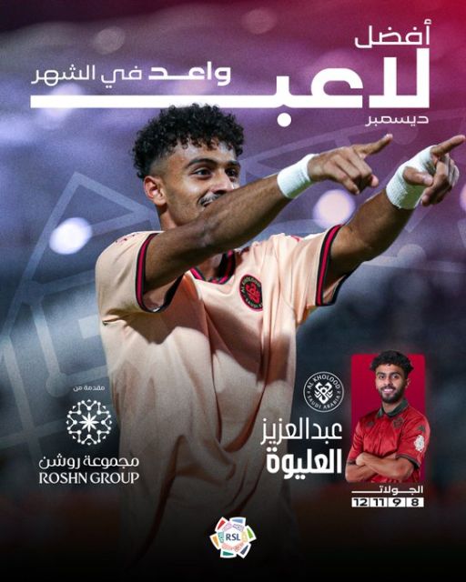 هاي كورة – تويج عبدالعزيز العليوة، لاعب نادي الخلود، بجائزة أفضل لاعب واعد عن شهر ديسمبر.