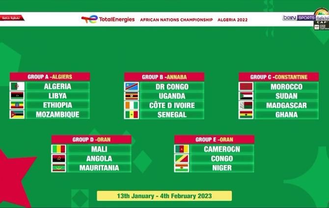 وسيتنافس "محاربو الصحراء" و"فرسان المتوسّط" في المجموعة الأولى مع منتخبي إثيوبيا وموزمبيق فيما تكتمل مجموعة "أسود الأطلس" و"صقور الجديان" بمنتخبي مدغشقر وغانا.
