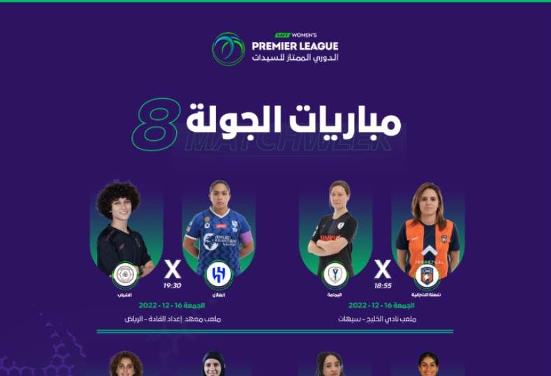 وتشهد مباريات الجولة الثامنة صراع ناري ومنافسة قوية ستجمع المحترفات المصريات وجهًا لوجه حيث يخوض فريق سيدات الشباب مباراته أمام الهلال يوم الجمعة على ملعب معهد إعداد القادة بالرياض.