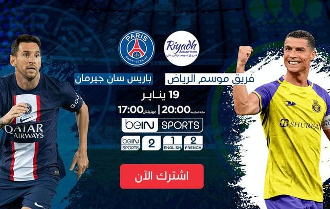 اشترك الآن كي لا تفوت المواجهة المرتقبة بين ميسي ورونالدو في كأس موسم الرياض الذي يجمع باريس سان جيرمان بنجوم فريقي الهلال والنصر غداً. قم بزيارة bein.com/subscribe