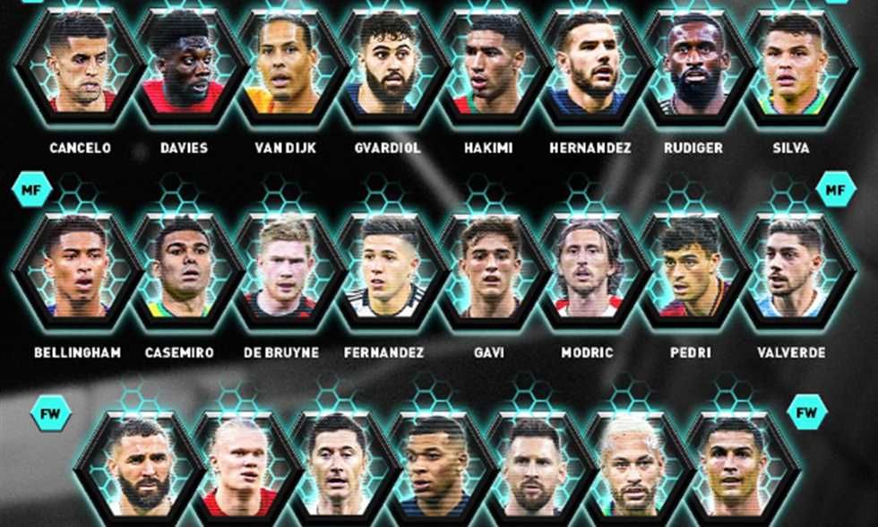 الهجوم: كريم بنزيمة - إرلينج هالاند - روبيرت ليفاندوفسكي - كيليان مبابي - ليونيل ميسي - نيمار جونيور - كريستيانو رونالدو