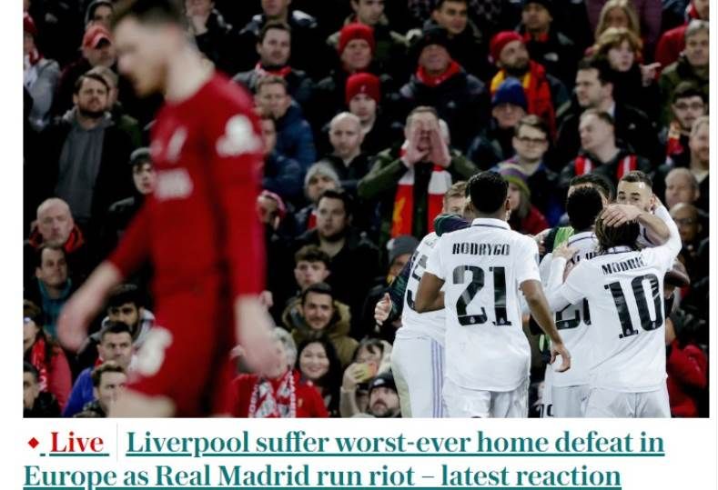 عنونت صحيفة "ديلي تلجراف" غلافها بجملة "ليفربول تلقى أسوأ هزيمة على الإطلاق على أرضه في أوروبا".