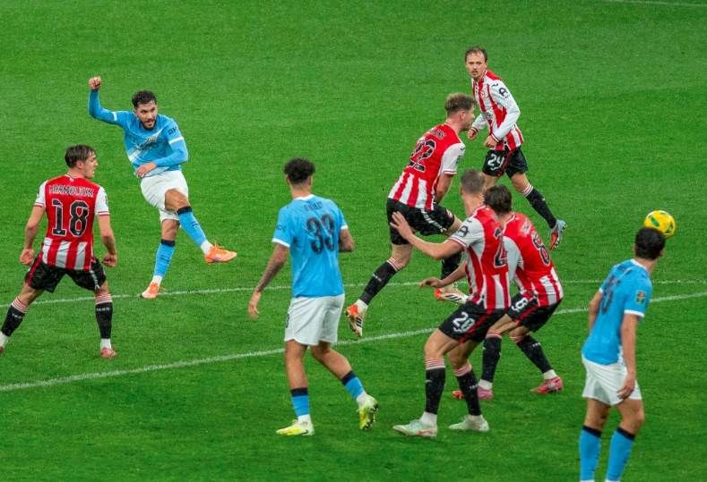 وشهد اللقاء محاولات مبكرة من السيتي، أبرزها تسديدة قوية من ريان شرقي من خارج منطقة الجزاء، إلا أن الكرة مرت بجوار القائم الأيسر بقليل إلى خارج الملعب.