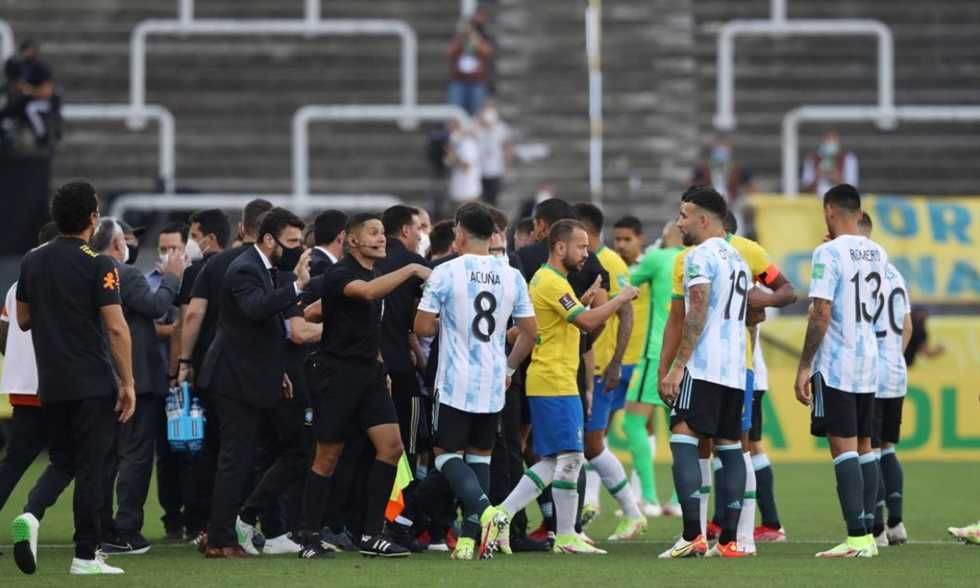 7 دقائق فقط مرت عندما توقفت المباراة لسبب غير مسبوق في عالم الرياضة، عندما ظهر موظفون رسميون برازيليون بحثا عن إيميليانو مارتينيز، وإيميليانو بوينديا، وجيوفاني لو سيلسو، وكريستيان روميرو رباعي الأرجنتين.