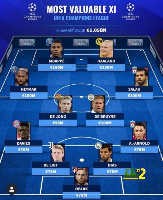 هذا وتبلغ قيمة التشكيلة 1.05 بليون يورو حيث تآلفت من ” اوبلاك ” 70 مليون ” ، دياز ” 75 مليون ” ، دي ليخت ” 75 مليون ” ، ارنولد ” 75 مليون” ، دافيز ” 70 مليون ” ، ديبالا ” 100 مليون ، دي يونج ” 90 مليون ” ، محمد صلاح ” 100 مليون ، نيمار ” 100 مليون ” ، هالاند ” 130 مليون ” ومبابي ” 160 مليون “.