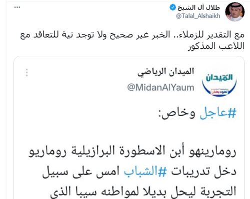 ونفى طلال آل الشيخ عبر حسابه بموقع التواصل الاجتماعي تويتر، هذا الخبر جملةً وتفصيلاً مؤكداً أنه غير صحيح التعاقد مع رومارينهو نجل روماريو.