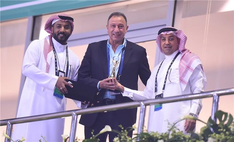 كرم الاتحاد السعودي لكرة اليد، محمود الخطيب، رئيس النادي الأهلي، على هامش بطولة العالم للأندية لكرة اليد سوبر جلوب 2021.
