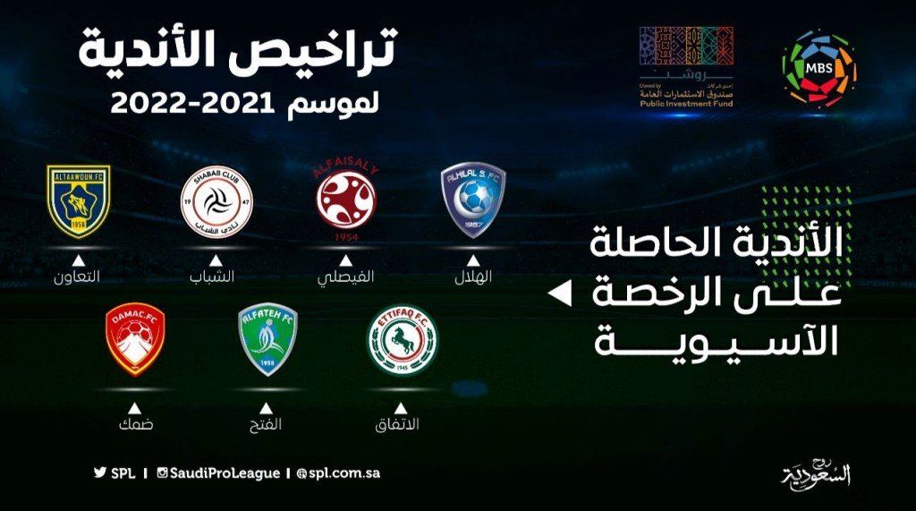 أعلنت رابطة الدوري السعودي للمحترفين، رسمياً اليوم الخميس، عن الأندية الحاصلة على الرخصة الآسيوية الخاصة بالموسم الحالي 2021-2022.